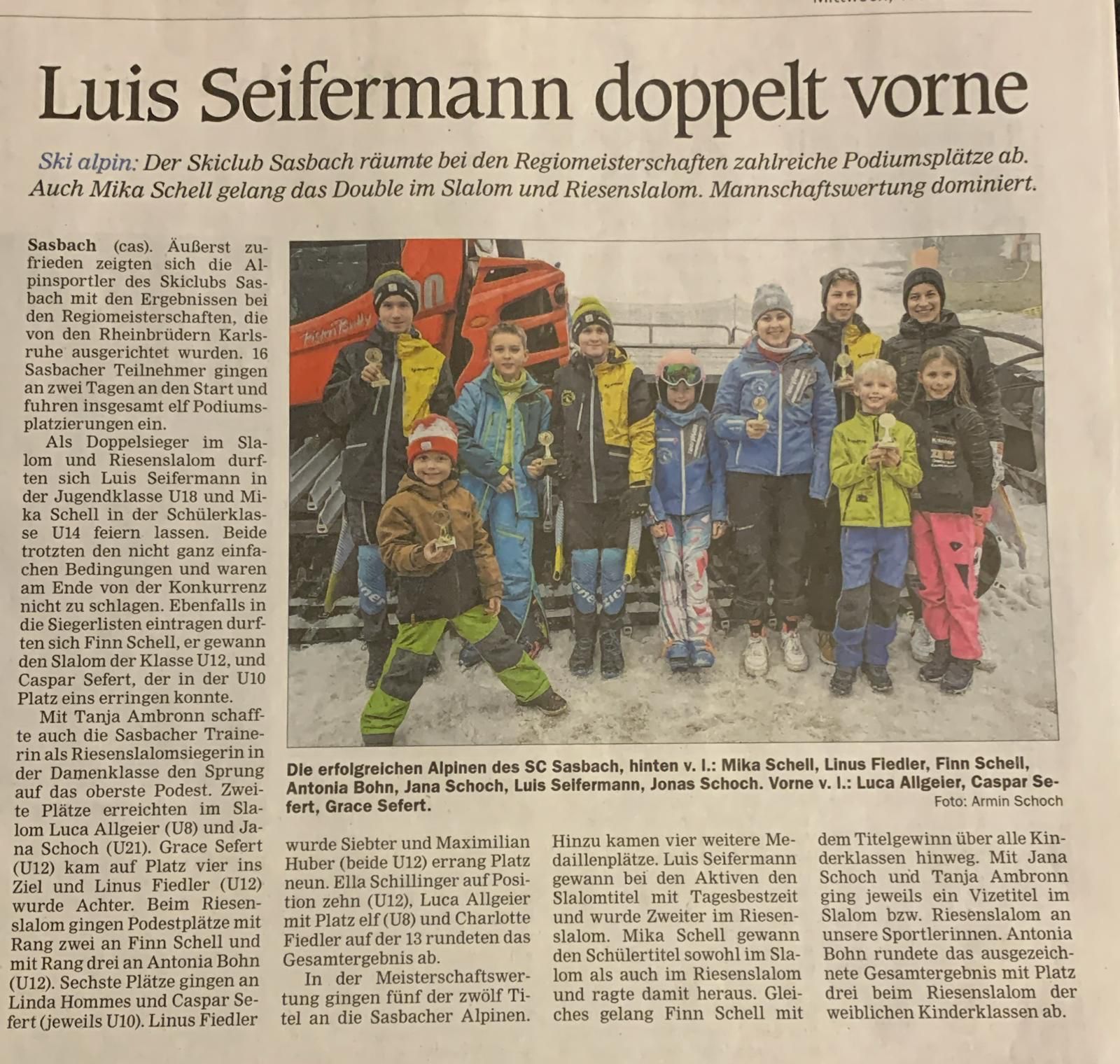 In der Klasse U12 startete Finn Schell bei den Westdeutschen Skimeisterschaften in Schöneben am Reschensee. Auf der anspruchsvollen Rennstrecke fuhr er nach Platz 3 in Lauf 1 mit Laufbestzeit noch auf den zweiten Rang nach vorne. Im Slalom lies er nichts anbrennen. Sowohl im ersten als auch im zweiten Durchgang fuhr er zur Bestzeit und sicherte sich den verdienten Sieg. Mit Grace Sefert ging auch bei den Mädchen eine Sasbacher Nachwuchssportlerin an den Start. Sie durfte sich am Ende über den guten fünften Platz freuen.